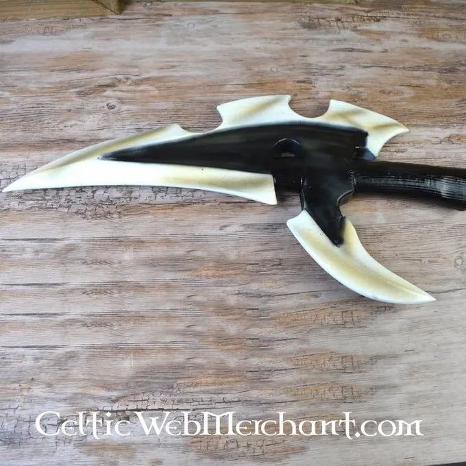 Dark Elven oorlogsbijl. Deze LARP bijl heeft een totale lengte van 100 cm. De bijlkop heeft een lengte van ca. 32 cm en de hoogte van de bijlkop zelf is ca. 55 cm, het gewicht is 345 g. De bijl heeft als kern een buigzame glasvezel staaf. omgeven door een laag duurzaam foam, bedekt met een stevige latexlaag. De bijl is met de hand gemaakt en gekleurd, waardoor ieder exemplaar uniek is. Vanwege het materiaal is het af te raden de bijl langdurig in de zon te leggen. De Dark Elven oorlogsbijl van Epic Armoury voldoet aan hoge veiligheidsnormen.