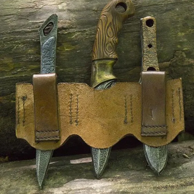 Deze handige houder is gemaakt van een hoge kwaliteit natuurlijk gekleurd leer. Hij is geschikt om Epic Armoury LARP werpmessen in de dragen. De houder wordt bovendien geleverd inclusief drie werpmessen uit de huidige Epic Armoury collectie (zie foto)! Zo kan je een begin maken aan je verzameling LARP werpmessen.