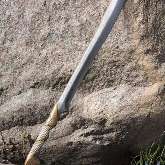 Dit Elven jachtmes is geïnspireerd door de elfenwereld. Het zwaard is 75 cm lang en heeft een kling met een kromming die perfect is voor het opruimen van gevaren. De gedetailleerde grip heeft een handgeverfde afwerking die eruit ziet als vervaagd goud rond gepolijst essenhout. Door de ribbels in de grip glipt hij niet uit je handen. De kling is ook levensecht geverfd.
