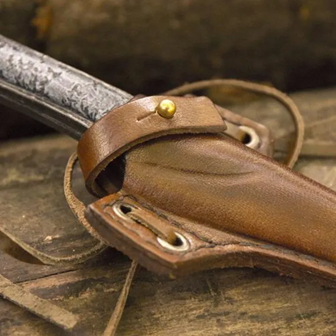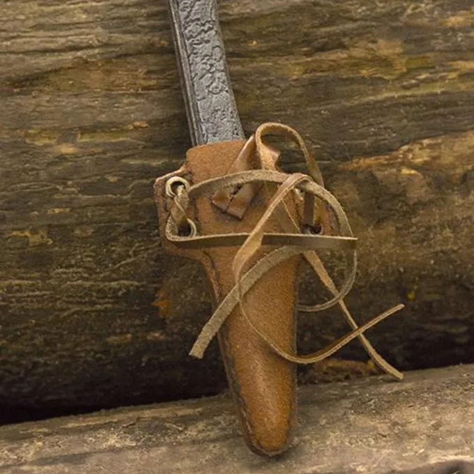Materiaal: 100% natuurlijk gekleurd leer / / Kleur: bruin / / Set: 1 houder en 1 LARP killermes / / Lengte houder: 12 cm /