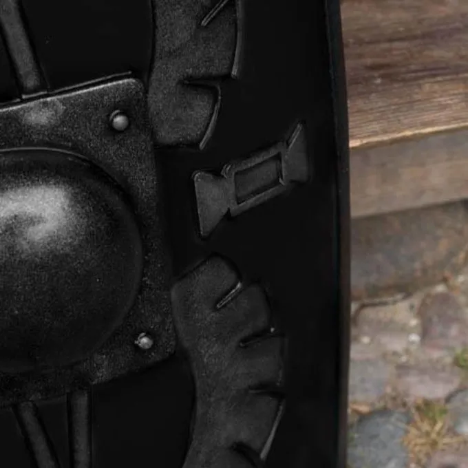 Dit LARP schild is gebaseerd op de Romeinse schilden uit de Klassieke Oudheid. Hij is levensecht geschilderd met een gladde zwarte achtergrond en de schildknop en randen lijken net van staal gemaakt, inclusief imitatie stalen klinknagels. Aan de achterkant heeft hij een handvat zodat je hem comfortabel vast kunt houden. Hij is geschikt voor links- en rechtshandigen.