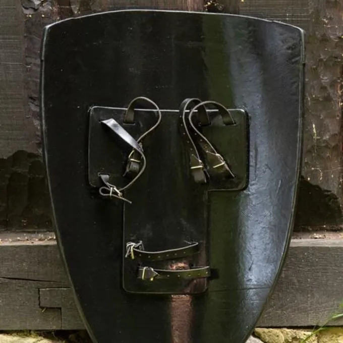 Dit LARP schild is gebaseerd op de historische vliegerschilden die men gebruikte tijdens de Hoge Middeleeuwen. Dit waren ook de schilden die vaak meegingen op Kruistochten. Dit schild is gedecoreerd met een rood Tempelierskruis met een witte en zwarte achtergrond. Het schild is zo levensecht geverfd dat het lijkt alsof je de nerven van het hout door de verf kunt zien. De rand lijkt net van staal gemaakt inclusief imitatie stalen klinknagels. Het schild heeft aan de achterkant drie paar leren riemen, zodat je hem op verschillende manieren kunt dragen aan beide armen.