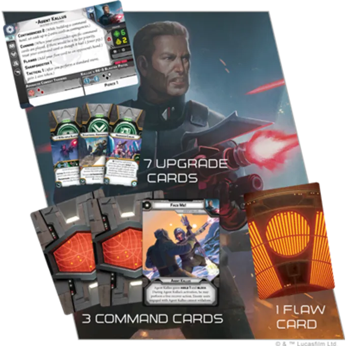 Terwijl deze functies de status van Kallus projecteren Als een meedogenloze ISB -agent schetst zijn eenheidskaart duidelijk al zijn capaciteiten en zijn drie handtekening commandokaarten weerspiegelen zijn vermogen om uw strategie vorm te geven. Ondanks al zijn vaardigheden is Kallus nog steeds vatbaar voor het sympathiseren van zijn vijanden, een zwakte die wordt weerspiegeld in de foutkaart die bij deze uitbreiding is opgenomen. Ten slotte berekent Agent Kallus zorgvuldig wat hij nodig heeft voor elke strijd en zeven upgrade -kaarten nodig je uit om de uitrusting en training te kiezen die het beste bij je strijdplan past.