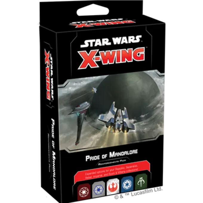 De trots van Mandalore -versterkingspakket omvat nieuw schip en upgrade -kaarten voor sterren voor sterren voor sterren en upgrade -kaarten voor sterren voor sterren en upgrade -kaarten voor sterren voor sterren en upgrade -kaarten voor sterren voor sterren en upgrade -kaarten voor sterren voor sterren en upgrade -kaarten voor sterren. Wars: X- Wing, waardoor spelers hun bestaande schepen kunnen besturen met nieuwe personages die worden gezien in de Mandalorian, Star Wars: The Clone Wars en Star Wars: Rebels. Naast nieuwe piloten en upgrade -kaarten die bruikbaar zijn door vijf facties; Nieuwe tokens en obstakels zijn ook inbegrepen. Ten slotte bevat het versterkingspakket ook wijzerplaten en schiptokens om de Fang -jager te converteren naar de Rebel Alliance!