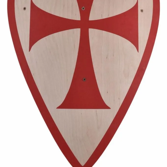 Dit schild is gedecoreerd met een Tempelierskruis (rood op een witte achtergrond). Hij heeft een rode rand. De achterkant van het schild heeft een houten handvat om hem vast te houden.