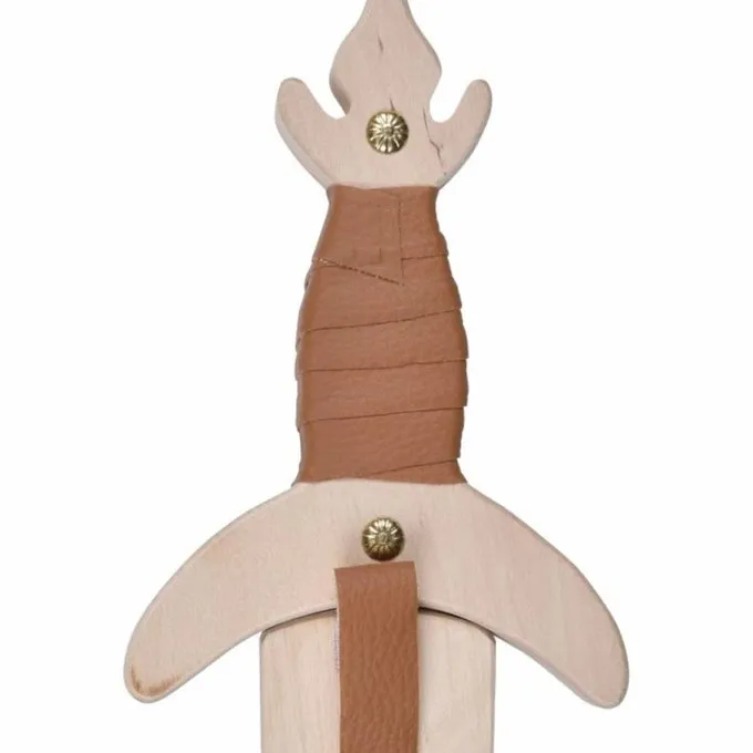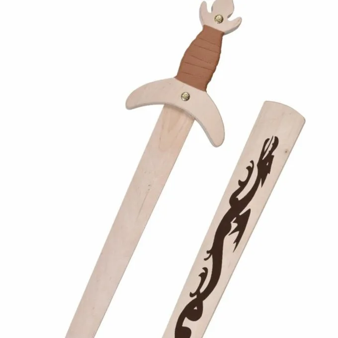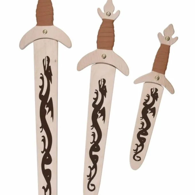 Dit houten speelgoedzwaard is gemaakt naar middeleeuwse modellen. Hij is verkrijgbaar in drie verschillende lengtes. Hij heeft een mooie houten schede met een draak erop.